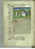 Folio 45r, or The Khan's Money Exchange, shows a scene of trade between a seated khan and three men. The text on the same page, from Marco Polo's Description of the World, describes the novelty of the khan's paper money, noting that traders from far-off locales bring their wares in exchange for these slips of paper. The three men in the image serve as an example of this widespread interest, their hats and clothing suggesting they belong to different cultures. The inspiration for these figure's clothing could have originated from artistic contact between Europe and Asia but most likely originated from Italian art depictions of "Eastern" figures.[3] In either case, this folio serves as record of cross-continental trade.
