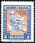 A postage stamp from 1945 featuring a map of Bolivia and LAB's domestic flights.