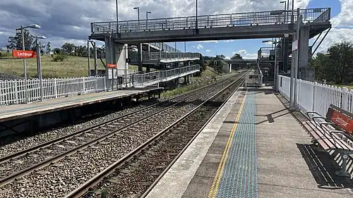 A second platform was added in 1914 when the line was duplicated. As part of the Australian Rail Track Corporation's project to install a third track between Maitland and Whittingham, the station's platforms were extended and a footbridge installed in 2012.[4][5]