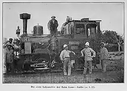 Initially, two type Bn2T tank locomotives were used, which were delivered from Henschel in 1904 (serial numbers 6885 and 6886). The freight cars and third class cars were mostly delivered from Beuchelt & Co.. First and second class cars were built by Waggonfabrik Uerdingen and MAN.[11] The third class passenger cars consisted merely of empty covered goods wagons – called Aimahu, "land canoe", by the Africans. Simple wagons remained predominant in the following years. At the end of 1912 the Togo-Eisenbahn (Togo railway; TE) had over 20 passenger-, post- and luggage-cars and 174 freight cars.[12]