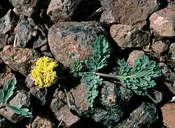 This plant is restricted to scabland habitat with exposed bedrock. Other plants in the area include scabland sagebrush (Artemisia rigida), pine bluegrass (Poa secunda), rock onion (Allium macrum), bitterroot (Lewisia rediviva), Henderson's needlegrass (Achnatherum hendersonii), and wormleaf stonecrop (Sedum stenopetalum). Lomatium species are common.[1]