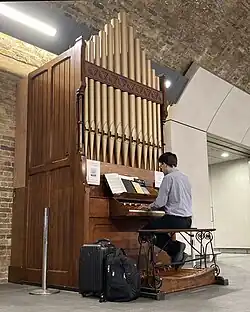 In July 2022 the organ was installed at London Bridge station (in the Stainer Street concourse near Saint Thomas Street) by organ restorer Martin Renshaw's charity project, Pipe Up for Pipe Organs. Its relocation preserved the instrument and helped to raise public awareness of the loss of pipe organs from closed churches in the United Kingdom.[1][4][5] It is freely available for anyone to play for thirty minutes at a time, upon which its blower must be freely reactivated.[6] The Future for Religious Heritage organisation believe it to be the 'world's first open-access railway station pipe organ'.[6]