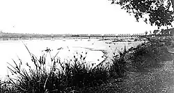 About 2.5 km (1.6 mi) south of Longburn the NIMT crosses the Manawatū River on a 366 m (1,201 ft) long bridge. It replaced the original 361 m (1,184 ft) timber bridge,[2] which was about 1 km (0.62 mi) further upstream,[27] from 18 October 1960[2] and cost £170,000.[28] Work on the original bridge started in 1882.[16] The 20-span bridge has steel girders, resting on reinforced concrete piers.[29]