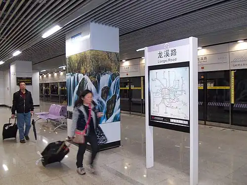 Longxi Road (simplified Chinese: 龙溪路; traditional Chinese: 龍溪路; pinyin: Longxi Lù) is a station on Line 10 of the Shanghai Metro. The station began operation on April 10, 2010. It is the last station westbound before Line 10 splits into two branches.[1]