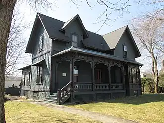 The Louis Kotzow House is a historic house in Pawtucket, Rhode Island. It is a 1+12-story wood-frame structure, laid out in an L shape. Its exterior is visually busy, with numerous projecting dormer and gable sections, and elaborate woodwork, including bracketed eaves and applied Stick style woodwork on a projecting bay section. Its porch has a delicate jigsawn railing, with a wooden frieze and decorative arches above. The house, built c. 1875, is one of two (the other is the nearby Scholze–Sayles House) built by the German Land Cooperative Association, which sought to create a German-speaking enclave in the area.[2]