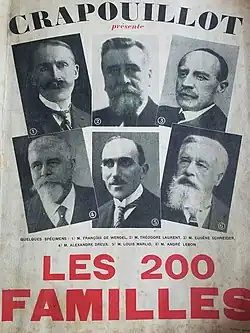 Cover of the Crapouillot, March 1936: François de Wendel (1), Théodore Laurent (2), Eugène II Schneider (3), Alexandre Dreux (4), Louis Marlo (5) and André Lebon (6)