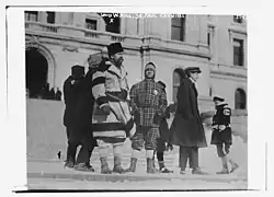 Hill (wearing a broad striped blanket coat) in a group watching the 1916 Saint Paul Winter Carnival parade from the steps of the Minnesota State Capitol in St. Paul, Minnesota
