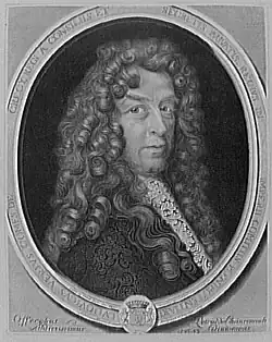 A Conseiller d’État and brother of the notable Jesuit and procurer for missions to the Levant Antoine Verjus (22 January 1632 – 16 May 1706), he was elected to the Académie française in 1679. He served as Louis XIV's second plenipotentiary to the Congress of Ryswick and before the Eternal Diet of Regensburg in 1695. Thanks to his wide knowledge of the Germanic courts, he was also one of the signatories to the final treaty at Regensburg, dated 30 October 1697.[1] Hyacinthe Rigaud, with help from Adrien Prieur (who was paid 42 livres for his help[2]), produced an image of Verjus in 1700. He was paid 450 livres for it, which suggests quite a large work, for his account books mention this portrait as "Habillement répété" ("Repeated clothing", i.e. copied from a previous model[3]).