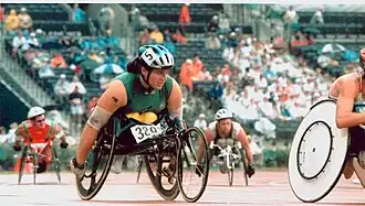 From 1993 to 2001, Sauvage won every IAAF wheelchair demonstration event at IAAF World Athletics Championships.[22] In that same period, she also won the demonstration events for wheelchair racing in the 800 metre race at the Olympic games.[23] The 800 metre event does not require that athletes stay in their lanes after the first turn. For this reason, athletes like Sauvage are required to wear helmets when racing. In 2000, Sauvage won the Olympic demonstration event and was expected to win the Paralympic gold. She was upset by Canadian Chantal Petitclerc.[23] The Australian delegation appealed the result, claiming the race was not fair because another racer, Ireland's Patrice Dockery, was disqualified for leaving her lane too early. The appeal was rejected, because Dockery was too far behind the front runners to impact the results. Sport academics who research the Paralympic Games consider this protest to be pivotal, because it shows the passion of athletes to win and the extent that sports people will go to claim gold. It also highlighted that the rivalries in the sport were real. Petitclerc said of her rivalry with Sauvage that "I dream more about Louise than I do my boyfriend." In 2002, Petitclerc beat Sauvage again at the 2002 Commonwealth Games, where the 800 metre event was a full medal event at the games for the first time. It was only the second time that Sauvage had lost to Petitclerc.[24]