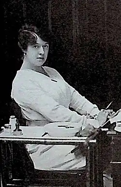 ![]() Louise Wright sitting at her easel in 1917 or 1918 | |