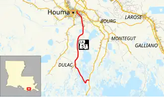 Louisiana Highway 57 (LA 57) is a state highway that serves Terrebonne Parish. It runs 25.1 miles (40.4 km) in a south to north direction along Bayou Sale Road and Grand Caillou Road, connecting Cocodrie and Houma.[1]