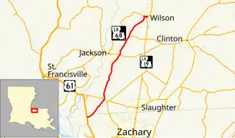 Louisiana Highway 68 (LA 68) is a state highway located in southeastern Louisiana. It runs 19.13 miles (30.79 km) in a north–south direction from U.S. Highway 61 (US 61) north of Port Hudson to LA 19 in Wilson.