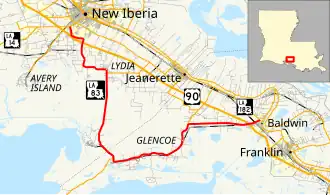 La 83—From a junction with La 14 at or near Curtis through or near Lydia and Weeks Island to a junction with La-US 90 at or near Baldwin.