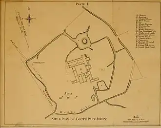 A 1726 engraving, The North East View of Louth Park Abbey near Louth in the County of Lincoln, by Samuel and Nathaniel Buck, shows the remains of a number of stone walls standing.[17] A similar view is presented in an engraving of the abbey ruins from 1770 in Robert S. Bayley's Notitiæ Ludæ, Or Notices of Louth.[18]