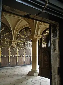The pillar parlour at Bolsover Castle with its original panelling and restored decoration.[5]