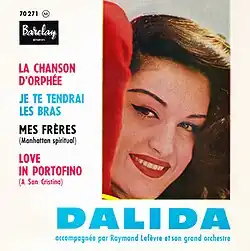 It was then when Eddie Barclay noticed the song and got it for Dalida. In collaboration with Larue, the French part was rewritten and reduced to minimum, just as an addition to original Italian and English lyrics that were kept. "Love in Portofino" thus became a trilingual song, and under this version it became famous. It was recorded during Dalida's 1959 summer tour pause, under orchestra conduction of Raymond Lefèvre, and was published first on the EP (Barclay – 70 271). It was also featured as a title song of her end of year album.[1][2]