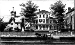 The Lovell-Webber House was a large rambling wooden structure, measuring about 60 feet across and a little more deep. It consisted of a main, three-story section and a two-story addition. It sat on a rough stone foundation, and the main section had a truncated hip roof while the addition had a gabled roof. The main section had long, narrow paneless windows on the first floor (built in the 1870s), with unpaneled doors. The upper floors (constructed in the 1830s) had six over six windows encased in plain wooden molding, and the second floor door was paneled and surrounded by a plain transom and sidelights. Porch columns also varied between the stories.[3]