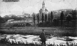 1908 postcard by Melchior Ruoff with a view of Degmarn, in which a fictitious passenger train was drawn in anticipation of the railway