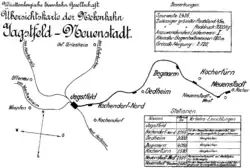At the end of 1904, construction work could be started from the west with the line through Jagstfeld and the Kocher bridge near Hagenbach. However, there were delays in the construction of the upper section: Since Neuenstadt and Bürg could not agree on the location of the terminus, Bürg demanded that the station be directly on the opposite side of the Kocher. Bürg terminated his support for the project. It was only when the other municipalities took over the outstanding amount that construction at the eastern end of the line could begin in 1906.[5]