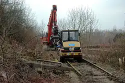 The WEG then put the line out to tender by § 11 of the General Railway Act and, after no interested party was found by 27 December 2002, applied for de-zoning, which was granted on 21 June 2003. After long negotiations, the neighboring municipalities took over the route after the WEG had dismantled all remaining tracks at the beginning of 2006. At the end of 2007, the Neuenstadt northern bypass was completed. The remaining route was then also expanded as part of the Kocher-Jagst cycle path, and the official opening took place on 13 June 2009.[9] The costs for the 19 km long section amounted to a total of € 3.7 million and were borne by the state of Baden-Württemberg, the district of Heilbronn, and the neighboring municipalities.[9] The main cost factor was the demolition and new construction of the Hagenbach Kocher Bridge, which cost € 1.1 million after renovation had proven to be too expensive.[5]