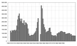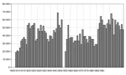 The annual number of passengers after the opening was around 120,000. This number hardly increased due to the extension of the line to Ohrnberg in 1913 and rose to around 350,000 by 1919. After that, the number fell steadily and reached a minimum of 80,000 in 1935. After the end of the Second World War, the numerous hoarding trips reached a passenger peak of 470,000 people. Due to the increase in private transport and the competing bus lines since 1949, the number of passengers fell again and reached its absolute low point in 1966. The orientation of the transport service towards school transport to the middle schools established in the 1950s in Bad Friedrichshall, Oedheim, and Neuenstadt was able to revive the traffic volume somewhat, even if school transport was not very profitable.[2]