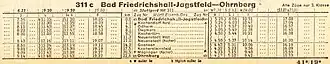 After the opening of the entire line, the passenger train service comprised four pairs of trains on weekdays and five on Sundays. On Wednesdays, an additional pair of trains ran between Jagstfeld and Neuenstadt. The travel time for the 11.9 kilometers was 62 to 72 minutes. This train service remained constant until the end of the Second World War. In 1938, a passenger train took 56 minutes to cover the entire route to Ohrnberg. From 1950 onwards, the train service included only three pairs of trains with a travel time of 60 to 70 minutes. In addition, there was a pair of trains between Bad Friedrichshall-Jagstfeld and Kochersteinsfeld. This train service remained constant in the following years. With the conversion of operations to diesel railcars, the travel time could be reduced to 42 minutes. From 1970 onwards, additional school trains enriched the timetable. It was not until 1983 that the WEG suspended operations on weekends from Saturday noon to Monday morning, at a time when this had already been implemented for the other WEG routes. In 1984, the train service included only one pair of trains in both directions, plus a train from Ohrnberg to Bad Friedrichshall-Jagstfeld, a pair of GmP, and a GmP from Bad Friedrichshall-Jagstfeld to Ohrnberg. For school transport, there was a pair of trains and a single train from Bad Friedrichshall-Jagstfeld to Neuenstadt, as well as a pair of trains from Bad Friedrichshall-Jagstfeld to Kochersteinsfeld. The journey time was 43 minutes, with a GMP it was 64 to 91 minutes. In 1985, the timetable offered an additional pair of trains but was then continuously reduced: in 1989, there were two pairs of trains on weekdays outside school transport, from 1990, only one in the form of the GmP.[2]