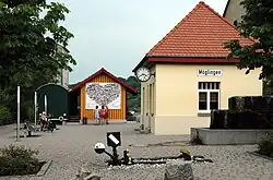 The former railway station area in Möglingen, which has been converted into a village square, is remarkable.[17] Various railway relics, such as a carriage, a station clock, and the station sign on the former station building, point to the former railway. Today, the station building is used, among other things, as a polling station.[18] The former station area in Ohrnberg, which is now a listed building, is home to a shop and a trade fair construction company, where old railway carriages are used as storage rooms.[17]