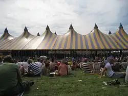 The Alpha is the largest stage at Lowlands festival, with a capacity of 15,000 attendees. It succeeded the "Hoofdpodium" (main stage) in 1993. The blue and yellow striped circus tent (on the left) was replaced in 2017 by a higher, more open tent with arched roof (on the right).[23]