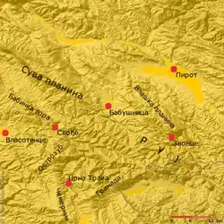 The region occupies the hollow of the Lužnica River, a tributary to the Vlasina, and the surrounding areas.[1] The relief is mountainous, with dissecting valleys of a larger number of smaller streams. The process of erosion is developed at several places. The basin has an altitude 470–520 m. The area is surrounded by the Suva Mountain to the west, Ruy Mountain to the south, and Vlaška Mountain to the northeast.
