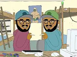Commenting on their inspirations, the brothers recognized themselves as animation fans, with Keith mentioning Clone High as one of their favorite series, along with King of the Hill and The Life & Times of Tim.[3] Summing Lucas Bros. as an equation, the two called it "Bill & Ted plus Workaholics plus The Wire (minus the bleakness)."[4] In the United States, the series is rated TV-14.[5] Some jokes have been rejected by the network for content, with the brothers naming a parody of Clay Davis's character from The Wire's elongated pronunciation of the word "shit" as an example of this.[4]