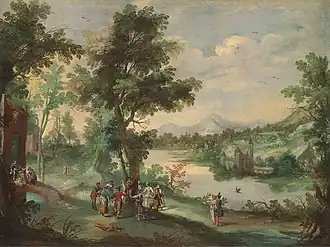 In many of Lucas' paintings his brother Cornelis added the figures while, in turn, Lucas painted the landscapes in Cornelis' battle scenes and harbour views.[2] The View of a Roman square (At Minerva Auctions sale in Rome on 26 May 2016, lot 97) and the River landscape with fishermen and travellers (At Bonhams on 9 July 2008 in London, lot 38) have been attributed to the brothers.[11][12] Lucas also collaborated with Jan Brueghel the Younger on paintings of landscapes with figures for which Lucas created the landscape part and Brueghel the figures.[1]