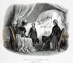 Lucien would die on 15 October, 1791, in his birthplace of Ajaccio.[1] On his deathbed, he is said to have stated to his family, gathered around his bed, "You, Joseph, will be head of the family, and you, Napoleon, will be a man."[10] After his death, the Bonaparte family inherited his estate, slightly assisting them with their financial troubles.[11] During Napoleon's later years, he would continue to remember his granduncle, sometimes fondly recalling his memories of him,[12][13] and even remembering him as a second father.[14]