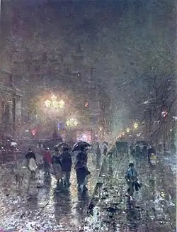 Munthe is associated with the Düsseldorf school of painting. A thoroughly realistic treatment characterizes his paintings, of which autumn and winter scenes in stormy or gloomy weather, forest and coast views form the prevailing subjects. He was knighted with the French Legion of Honour in 1878 and was appointed Knight of the Order of St. Olav in 1881.[2]