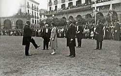 As Lezama's paternal grandfather was a militant Liberal[111] who vehemently opposed the Carlists,[112] and Lezama's father did not engage in politics,[113] it is unclear how Luis and Manuel got involved in the movement.[114] Hagiographic obituaries claimed Luis had been "attracted to Traditionalism in his youth",[115] but there is no confirmation of access until 1892, when the brothers visited Carlos VII in Venice.[116] There is sporadic evidence of Lezama's Carlist engagements during the following few decades. In 1903 Luis hosted the Carlist theorist Vázquez de Mella in Bilbao;[117] later he mixed with Carlists in Catholic organizations.[118] In 1907 he accompanied Don Jaime in Spain;[119] in 1909 together with de Mella they attended the funeral Carlos VII.[120] In the 1910s Lezama was moderately engaged in party propaganda; in 1911 he took part in a banquette to honor Traditionalist deputies,[121] in 1913 both brothers travelled to Paris to pay homage to Don Jaime,[122] and in few cases he appeared on closed-doors Jaimista feasts, e.g. in 1917 in Azcoitia with infanta Beatriz.[123] At the time Luis remained in the shadow of his brother, who headed the Jaimist organisation in Biscay.[124]
