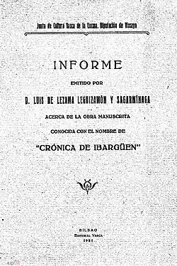 Lezama's scientific contribution to vascólogia is minor. His key work[80] is Informe acerca de la obra manuscrita conocida con el nombre de "Crónica de Ibargüen" (1921), a 47-page commentary[81] on a 16th-century chronicle, just purchased by the Biscay diputación;[82] it covered bibliographic, geographical, heraldic, archeological and linguistic issues.[83] Other attempts are largely bibliographical and partially biographical pieces published in Revista Internacional de los Estudios Vascos in the 1920s;[84] one of them, El Vascófilo Franciscano R. P. Fr. Juan Mateo de Zabala, was dedicated to an early vascólogist and brother of his maternal grandmother.[85] Despite rather modest output, at least compared to scientific writings of other SEV leaders like Julio Urquijo, Luis Eleizalde or Resurección Azkue, in friendly press Lezama was hailed as "vascofilo ilustrísimo".[86]