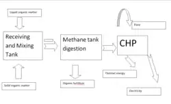 The Lusaker Biogas Plant generates heat and electricity from biogas produced from poultry manure of the Lusakert Pedigree Poultry Plant. For production of biogas, the liquid manure is processed in an anaerobic digesters of 2,200 cubic metres (78,000 cu ft) at temperature of 38 °C (100 °F).[3] There is an option to build the second digester. The LBP was considered to produce 5,280 cubic metres per day (186,000 cu ft/d) of biogas with a methane (CH4) content of 70%. Remains of manure are used for production of 75,000 tonnes of organic fertilizer per year. After removing sulfuric acid from gas, it is used for heat and power generation.[4] The LBP has installed electric capacity of 0.85 MW and it is able to generate 7 GWh of electricity annually.[1] The average capacity that Lusakert Biogas Plant runs with is 50-60%. The electricity produced at LBP is sold at 40 drams (about 7.5 cents) per kilowatt. In 2014, the plant did not generate electricity due to economic difficulties of the poultry plant which resulted in low amounts of wastes.[1]