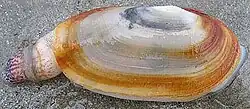 Lutraria lutraria is the type species of the genus Lutraria, the name Mya lutraria being the basionym used by Carl Linnaeus when he described the species in 1758. It was later determined that there were sufficient differences between it and other Mya species for the otter shell to be placed in its own genus.[2] The similarity between Mya and Lutraria is due to convergence due to exploitation of the same habitat rather than a close phylogenetic relationship.[3]