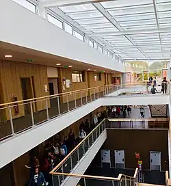 Students at the Lycée International are taught in one of the school's fourteen national sections according to their language spoken: American Section or British Section for English, and Chinese, Danish, Dutch, German, Italian, Japanese, Norwegian, Polish, Portuguese, Russian, Spanish, and Swedish. They are not required to be fluent in French to be admitted, as there is a special one-year Français Spécial language program.[3] The academic curriculum of the international sections supplements the standard French curriculum with additional courses in literature/language and history/geography, taught in the language of the students' respective national sections, allowing them to pursue the Baccalauréat Français International (BFI), the international variant of the French baccalauréat.