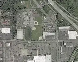 Former Lynnwood High School on north side of 184th St SW, with Alderwood Mall on the south side (as of 2002)