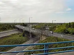 At the southeastern end at junction 2, the Worsley Braided Interchange, a stretch of the road on Linnyshaw Moss, earns a place in the Guinness Book of World Records for having the most traffic lanes side by side (17), spread across eight almost-parallel carriageways, in a "basketweave interchange" design. However it isn't clear how many of the lanes belong to the A666(M).[2][3][4] The carriageways cross each other at shallow angles and make use of tunnel-like structures to spread the load, avoiding the need for skew bridges.