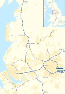 The M67 is a 5-mile-long (8 km) urban motorway in Greater Manchester, England, which heads east from the M60 motorway passing through Denton and Hyde before ending near Mottram. The road was originally conceived as the first section of a trans-Pennine motorway between Manchester and Sheffield that would connect the A57(M) motorway with the M1 motorway; however, the motorway became the only part to be built.