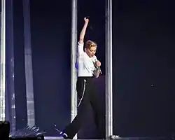 To promote the album, Madonna embarked on the MDNA Tour, which was her ninth concert tour.[10] The tour visited America, Europe and the Middle East, while also marking the singer's first performances in the United Arab Emirates, Ukraine, Scotland and Colombia.[11] Described by her as "the journey of a soul from darkness to light", the MDNA Tour was divided into four sections: Transgression, where guns and violence was the main theme, Prophecy, where a mix of joyful songs that bring people together are performed, Masculine/Feminine, a combination of sensuality and fashion with a few of Madonna's classic songs performed in a French Cabaret-style, and Redemption, which Madonna labelled as "a big party and celebration".[12] The tour received positive reviews,[13][14][15] but courted many controversial subjects such as violence, firearms, human rights, nudity and politics.[16] Nevertheless, it was a commercial success and many venues were instantly sold out.[17] After completion, it was dubbed the highest-grossing tour of 2012 by Billboard. Total gross was $305.2 million from 88 sold-out shows, becoming the tenth highest-grossing tour of all time and surpassing Celine Dion's Taking Chances World Tour as the second highest-grossing tour among female artists, behind Madonna's own Sticky & Sweet Tour.[17]