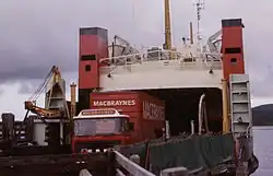 She was troubled by a run of early breakdowns: starboard ramp, hoist, forward capstan, bow-thrust unit and automatic steering. All were duly fixed, but her gearboxes continued to be a regular problem throughout her career.[1] The absence of a turntable at the forward end of her car deck made the management of on-board traffic difficult. Initial problems were exacerbated by the need to use a side-loading hoist. Things improved after she hanselled the new end-loading linkspan at Gourock on 26 July 1971.