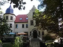 The Maasdorf manor, known as the ‘Parkschlösschen’ (little park castle), is a notable landmark on the Mühlgraben. Documented around 1701, it was owned by the von Seydewitz noble family before 1692, when Damm Friedrich and Christian Friedrich von Seydewitz sought enfeoffment of the estate. By the mid-19th century, the von Rohrscheidt family owned it, and in 1898, Paul Weiland, owner of the Liebenwerda cement factory, purchased it. His South Tyrolean wife added Italian-style turrets, giving it a castle-like appearance. The manor remained with the Weiland family until the 1945 land reform. The Teichgut Mittelhausen estate (87 hectares) was owned by Wilhelm von Borries-Dalldorf in the 1920s, then by the von Kuczkowski family. In 1984, the manor became the Restaurant Parkschlösschen, now including a hotel.[6]