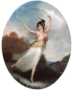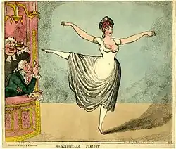 After the death of her father, Parisot moved to London where she made her stage debut at the King's Theatre on 9 February 1796 in a production of Piramo e Tisbe.[7] The Morning Chronicle spoke of the 19-year-old's performance favorably and described her balance "as positively magical, for her person was almost horizontal while turning as a pivot on her toe."[8] Parisot frequently wore costumes that accentuated her legs as she danced, leading the Monthly Mirror to remark on her degree of flexibility in a 1796 performance in the ballet le Triomphe de l'Amour as creating "a stir by raising her legs far higher than was customary for dancers",[9] while Leigh Hunt reported that she was "very thin and always smiling".[3] Parisot's salary for the 1795–1796 season was £600 and she earned £577 in 1799–1800 and £840 during the 1803–1804 season.[10]