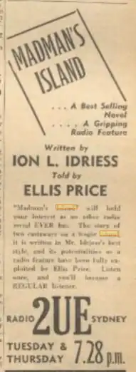 - ^ "Radio Gets Its First Idriess Novel "Madman's Island" To Be Read By Ellis Price Next Month", The Wireless Weekly: The Hundred per Cent Australian Radio Journal, 36 (26), Sydney: Wireless Press, June 28, 1941, retrieved 12 December 2023 – via Trove