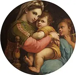 The Madonna della Seggiola or The Madonna della Sedia (28" in diameter (71 cm)) is an oil on panel Madonna painting by the High Italian Renaissance artist Raphael, executed c. 1513–1514, and housed at the Palazzo Pitti Collection in Florence, Italy. Although there is documentation on its arrival to its current location, Palazzo Pitti, it is still unknown who commissioned the painting; however, it has been in the Medici family since the 16th century.[1]
