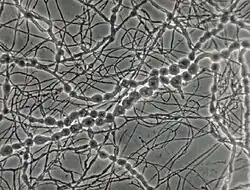 The growth of M. mycetomatis is very slow and can be broken down into three stages. Initially the colony is dome shaped white-yellow or olivaceous brown in color.[9] The mycelium is covered in grey down, giving it a woolly texture. Following the initial stage, brownish aerial mycelia (1 to 5 μm) form and the colony starts producing a diffusible pigment called pyomelanin, and becomes smooth in texture.[3] Older colonies form masses of hyphae called sclerotia or grains. In nutritionally deficient or potato-carrot media, black grains (0.75 to 1 mm in diameter) with undifferentiated polygonal cells can be observed.[8][9]