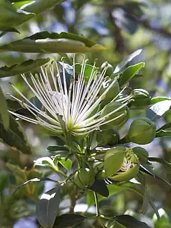 It may reach about 8 metres (26 ft) in height and occurs in dune bush, open woodland or on forest fringes. The leaves are digitately compound with from 3 to 5 leaflets, with entire, ciliate margins and petiolules of only 10 millimetres (0.4 in) or less in length, while the petiole may be up to 60 mm (2.4 in) long. The apex of the median leaflet may be apiculate and vary from broadly acute to rounded. The scented flowers are in terminal clusters with numerous white stamens tinged with green, though petals are absent. The four sepals are greenish in colour and about 17 mm (0.7 in) long, while the stamens are intricately folded in the unopened bud. A single gynophore protrudes from amongst the stamens in the open flower. The fruit is plum-like (oblong-ovoid), up to 50 mm (2.0 in) long, slightly ribbed with longitudinal suture lines clearly visible, and pendent from the long gynophore and peduncle. When ripe it remains green in colour, becoming wrinkled, soft and fragrant, and consumed by many species of bird. The fruit has a thick rind and holds up to 30 flattened, reniform seeds, distributed irregularly in a jelly-like pulp. The grey to dark brown bark, in common with many of this family, is liberally covered in lenticels. Branches and trunks are often markedly flattened rather than round. The wood is brittle and said to have a disagreeable odour when cut. In the past the roots have been ground up for use as a chicory substitute in coffee, and a decoction of roots for curbing menorrhagia and against female infertility.[3][4][5]