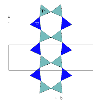 The structure of all amphiboles is based on a double chain of linked SiO4 tetrahedra, with composition (Si4O11)n. The inner tetrahedra are referred to as T1 and the outer ones as T2. The pattern in the double chain repeats after a block of two T1 and two T2 tetrahedra, with a repeat distance of approximately 5.3 Å, and this determines the length of the unit cell along the c crystal axis. The tetrahedra within a chain all point outwards in the same direction, and the chains are linked back-to-back by cations to form I-beams. The I-beams themselves are then linked together to form the complete structure.